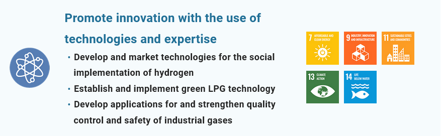Under our slogan “Creation of a more comfortable space on the Earth is what Iwatani wishes and strives for,” Iwatani strives to achieve solutions to the social challenge of environmental issues and to realize the Sustainable Development Goals (SDGs) by realizing a zero-CO2 society based on hydrogen.